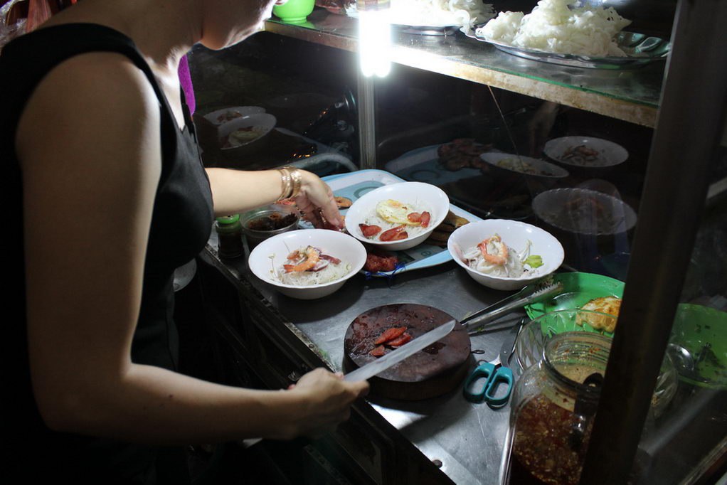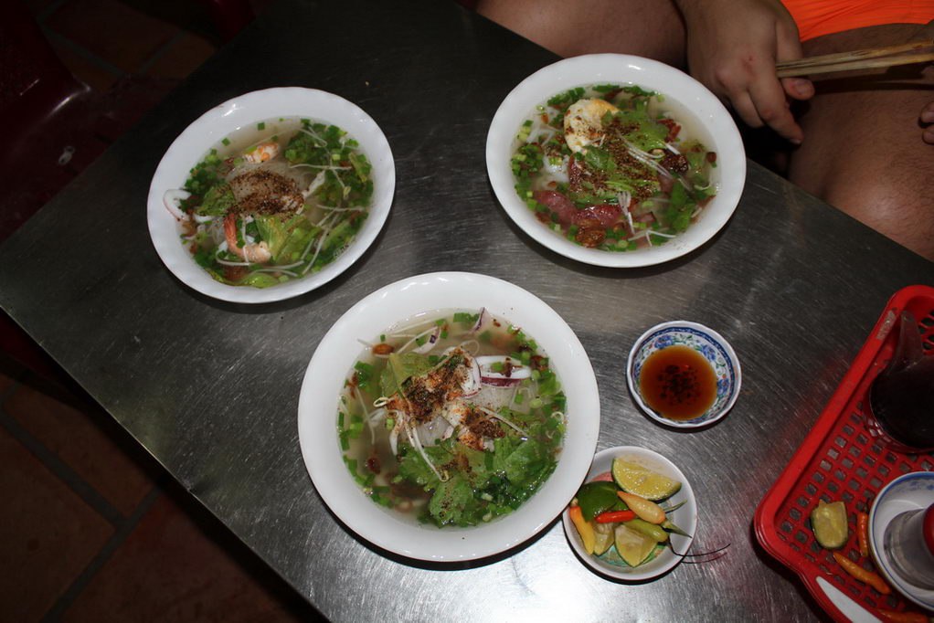 Практически напротив пиццерии, было расположено локал кафе, где мы с Настей довольно часто ужинали. Очень вкусный суп для Насти, из морепродуктов с наваристым мясным бульоном, который по вьетнамской традиции медленно томиться в течении всего дня. Порция риса с мясной отбивной и яйцом для меня. В качестве бонуса плошка бульона с зеленью и перцем для меня, чтобы запивать рис. Спустя некоторое время мы стали даже покупать отдельно бульон, чтобы дома приготовить подобный суп на ужин. Бульон иногда 10 000 донгов за пол литра (иногда в подарок), суп 40 000 и рис 10 000 донгов. На ужин менее 200 рублей на двоих, не удивительно почему мы не часто готовили дома.
