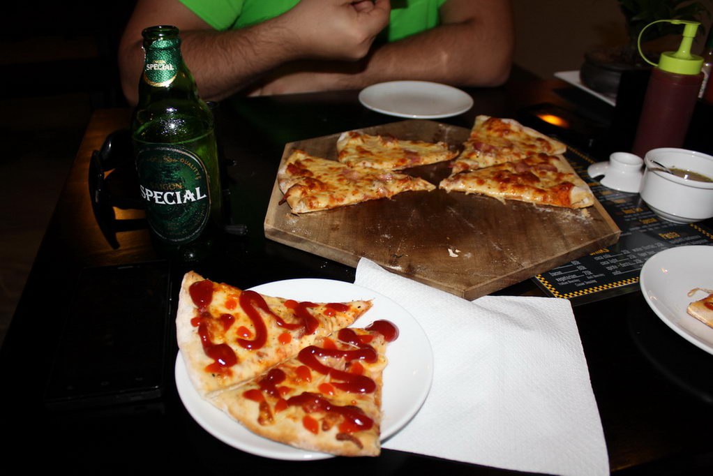 Пицца и пиво оказались очень достойными. Как я и говорил — Сайгон спешал — популярная марка пива. А халявный кетчуп, который позволил сдобрить пиццу получше. Во многих пиццериях мне этого очень не хватает.