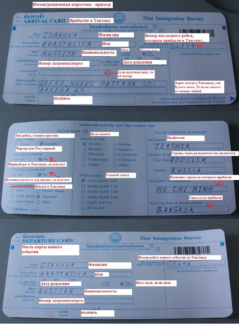 - Еще в самолёте вам выдадут иммиграционную карточку, которую необходимо будет заполнить на английском языке. Там ничего сложного нет, нужно переписать свои данные из загранпаспорта, номер рейса по которому прилетели в Таиланд, так же указать свою профессию и адрес проживания в Таиланде, и номер обратного рейса на странице (Departure card). Пример заполнения иммиграционной карточки в Таиланд смотрите на фото ниже.